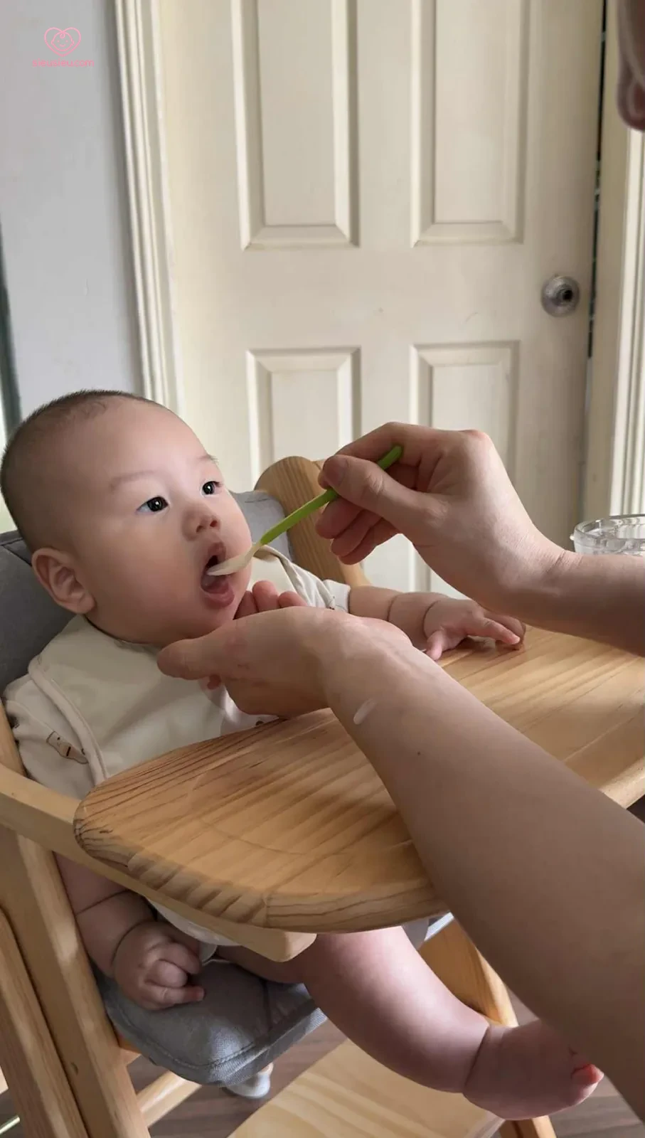 Ngày 1 con đã làm quen được vài muỗng cháo trắng. Sang ngày 2, mẹ vẫn giữ nguyên món này cho con – vừa an toàn, vừa theo đúng nguyên tắc “giới thiệu một loại thực phẩm trong 2–3 ngày đầu”. Và thật bất ngờ, hôm nay con tiến bộ thấy rõ.